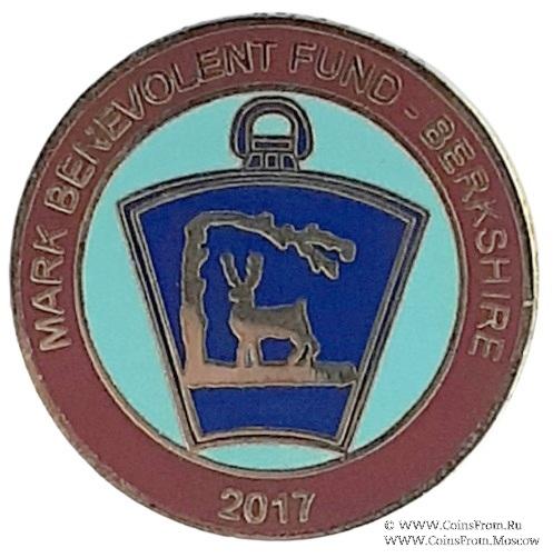 АВЕРС: двойной круг красной эмали с наименованием благотворительного фонда, провинции (Berkshire) и даты 2017. Внутри круга на голубом фоне изображение замкового камня с символами провинции проведения благотворительного фестиваля.