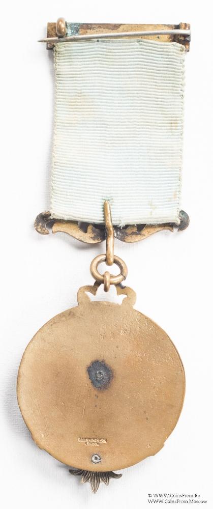 Знак круглой формы с фигурным кольцом в верхней части. По круг в синей эмали название провинции и института -EAST LANCASHIRE MASONIC BENEVOLENT INSTITUTION CORPORATED - КОРПОРАТИВНОЕ МАСОНСКОЕ УЧРЕЖДЕНИЕ БЛАГОТВОРИТЕЛЬНОГО ИНСТИТУТА ВОСТОЧНОГО ЛАНКАШИРА. В центре знака фигура аиста, выполненная из белой и чёрной эмали на фоне расходящихся лучей и опирающаяся на красно-белый бурлет над символической фигурой трилистника и лентой с надписью PATRIA AMICISQUE FIDELIS. Лента голубая, верхняя колодка прямая без надписей имеет с обратной стороны булавку для носки. Нижняя колодка стилизованная симметричная в центре с кольцом для крепления знака.