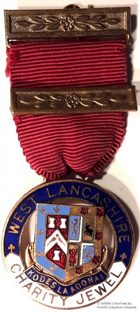 Знак двухслойный. Основа – круг сине-белой эмали вверху с названием провинции West Lancashire и названием знака на белом фоне Charity Jewel- благотворительный знак. В центре знака накладной малый герб Великой Ложи Англии в виде щита, ниже которого на ленте девиз: KODESLA ADONAI.