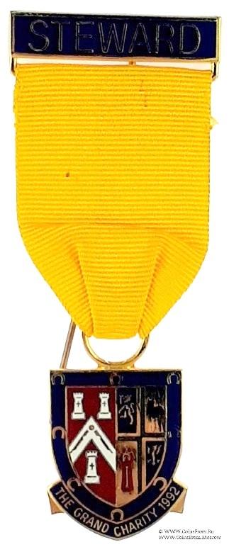 АВЕРС: малый герб Великой Ложи Англии в виде щита, окружённый полосой синего цвета с изображением восьми подков. Ниже герба лента с наименованием фестиваля (The Grand Charity) и даты проведения 1992.