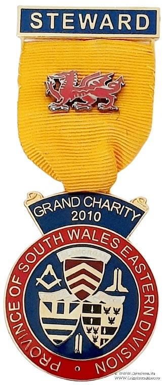 АВЕРС: в виде двойного круга с наименгованием провинции - Province of South Wales Eastern Division. Внутри круга три щита с символикой, наугольник с циркулем, отвеса. Верх знака украшен широкой лентой синей эмали с надписью: Grand Charity 2010.
