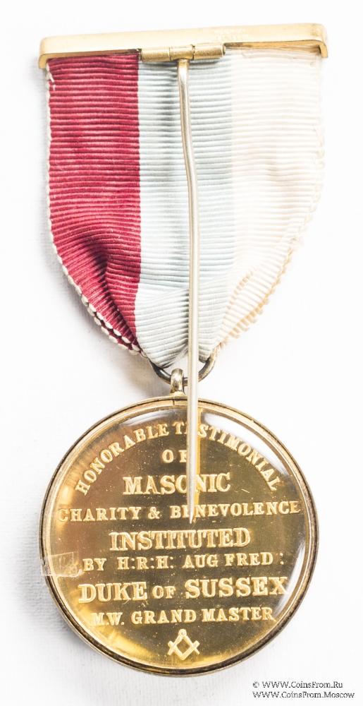 На реверсе: HONORABLE TESTIMONIAL OF MASONIC CHARITY&BENEVOLENCE INSTITUTED BY H:R:H:AUG FRED DUKE OF SUSSEXM.W. GRAND MASTER (ПОЧЕТНОЕ СВИДЕТЕЛЬСТВО О БЛАГОТВОРИТЕЛЬНОСТИ МАСОНСКОГО ИНСТИТУТА БЛАГОТВОРИТЕЛЬНОСТИ И ДОБРОЖЕЛАТЕЛЬНОСТИ ПО Ч:Р:Ч:АВГУСТА ФРЕД ГЕРЦОГ SUSSEXM.Вт. ГРАНД-МАСТЕР)