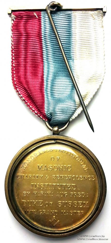 На реверсе: HONORABLE TESTIMONIAL OF MASONIC CHARITY&BENEVOLENCE INSTITUTED BY H:R:H:AUG FRED DUKE OF SUSSEXM.W. GRAND MASTER (ПОЧЕТНОЕ СВИДЕТЕЛЬСТВО О БЛАГОТВОРИТЕЛЬНОСТИ МАСОНСКОГО ИНСТИТУТА БЛАГОТВОРИТЕЛЬНОСТИ И ДОБРОЖЕЛАТЕЛЬНОСТИ ПО Ч:Р:Ч:АВГУСТА ФРЕД ГЕРЦОГ SUSSEXM.Вт. ГРАНД-МАСТЕР).