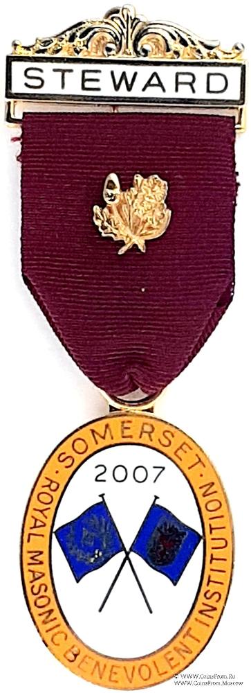 АВЕРС: в виде овала из жёлтой эмали с наименованием благотворительного заведения и провинции - Royal Masonic Benevolent Institution. Somerset. Внутри овала на белом фоне два перекрещенных флага и дата 2007.