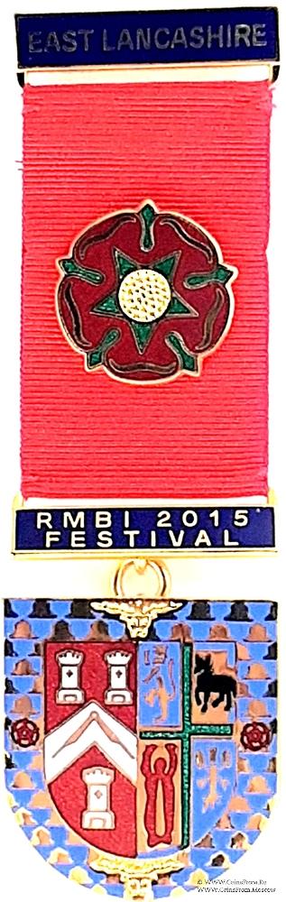 КОЛОДКИ/МЕДАЛЬОН: верхняя и нижняя колодки идентичные прямоугольной формы с прорезью для ленты. На верхней колодке наименование провинции East Lancashire (графство в северо-западной Англии). На нижней колодке надпись RMBI Festival 2015. В центре ленты медальон в виде красной розы. «Роза Ланкастеров» - символ Ланкашира.