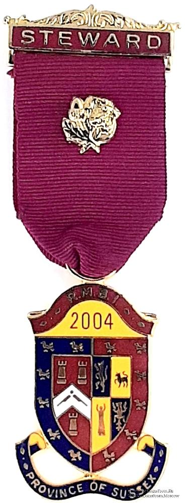 АВЕРС: в форме щита – малый герб Объединённой Великой Ложи Англии. Щит сверху и снизу украшен лентами. На верхней ленте аббревиатура благотворительного заведения RMBI, под лентой дата 2004. На нижней ленте наименование провинции – Province of Sussex.