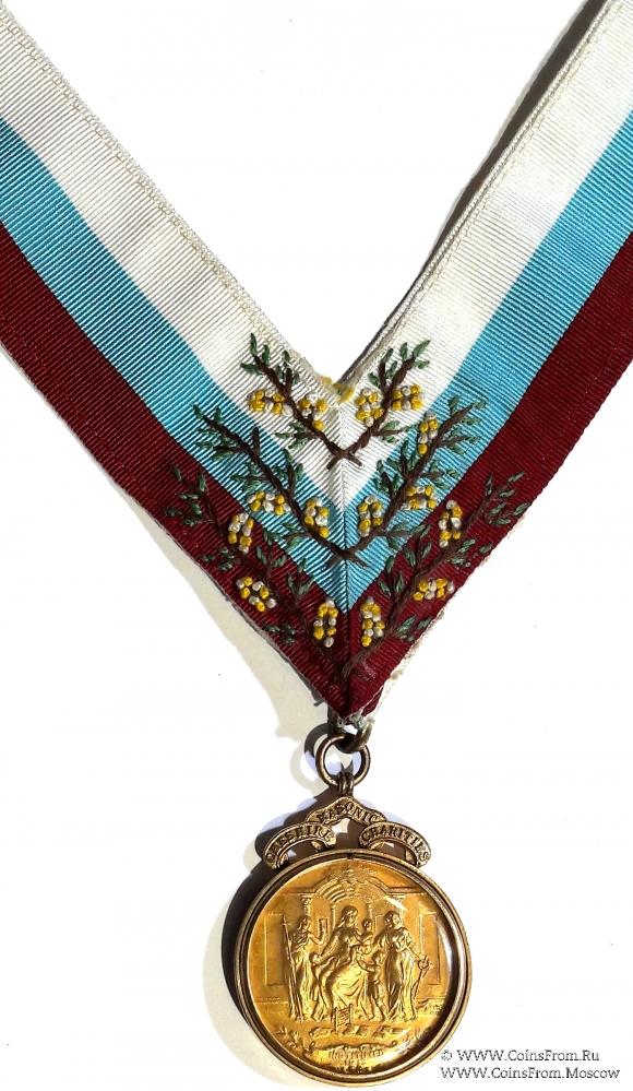 Реверс: слегка выпуклый с двумя щитами - элементами гербов. Справа щит герба Великой Ложи Ан-глии, слева часть герба Графства и графа Честер (этот титул с 1301 г. Присваивается только принцам Уэльским, наследникам английского престола). Ниже щитов на ленте с ветвями девиз ВЛА на латыни AUDI, VIDE, TACE – слушай, смотри и молчи. Сверху щитов в ветвях акации наугольник и циркуль. В углу наугольника 4 точки. Диаметр 40 мм. толщина – 8,6 мм.