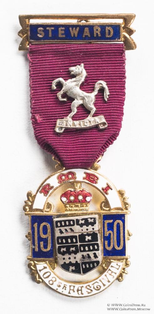 Знак овальной формы в центре накладной герб в виде многократно разделённого щита, увенчанного короной. Верхняя дуга – RMBI, нижняя – 108 PASGIVAL. На поперечной синей ленте дата 1950.