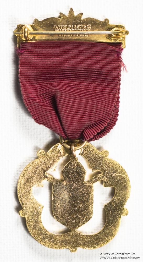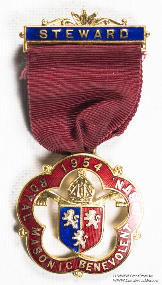 Знак в виде прорезного пятилепесткового цветка красной эмали с надписью ROYAL MASONIC BENEVOLENT INST. В центре малый герб в форме рассечённого щита. Правая половина лазурная, левая- червлёная. В правой, левой почётных точках и в средней точке основания щита изображения львов. Сверху щита на бурлете в виде шарфа тиара.