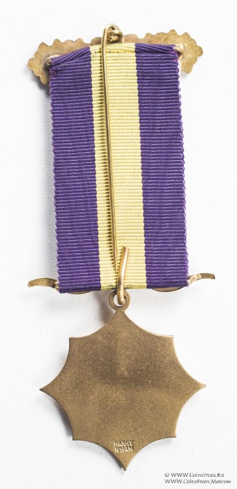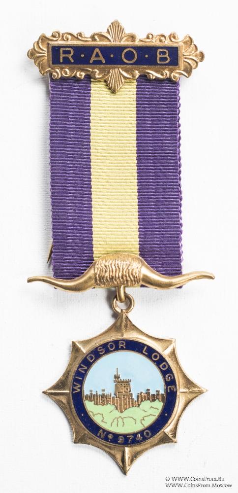 Медаль восьмиконечной формы посредством кольца соединена с нижней колодкой ленты. В синем круге надпись Виндзорская ложа № 9740.