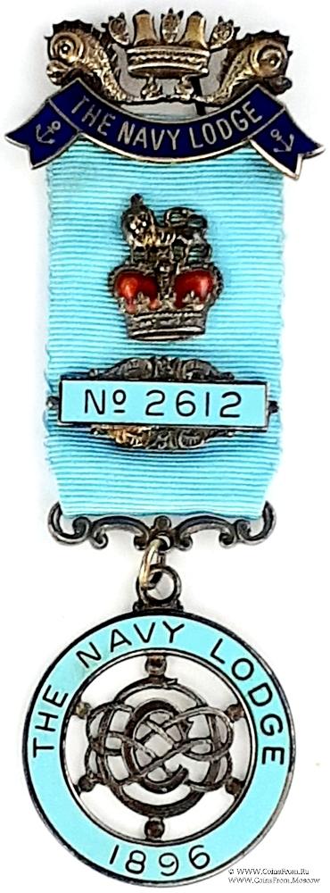 КОЛОДКИ/МЕДАЛЬОН: верхняя колодка в виде ленты с наименованием Ложи и якорями на концах. Сверху лента украшена двумя морскими коньками и короной между ними с символическими предметами. Нижняя колодка, витая с кольцом для знака. По центру ленты медальон жёлтого цвета с лентой голубой эмали и надписью номера Ложи № 2612. Второй медальон в виде венценосного льва на короне.