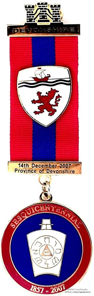 КОЛОДКИ/МЕДАЛЬОН: верхняя колодка прямоугольная с названием провинции Devonshire (графство в Юго-Западной Англии). Верх колодки украшен изображением трёх крепостных башен. Нижняя колодка прямоугольная с надписью: 14th December 2007 Province of Devonshire. В центре ленты медальон в форме щита отображающий малый герб провинции.