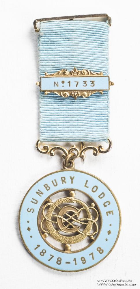 Медаль круглой формы с множеством масонских символов. В голубом круге надпись о юбилее ложи и даты 1878-1978. Внутри этого круга размещено сразу несколько символов: змея в виде кольца Уробо́рос — свернувшийся в кольцо змей, кусающий себя за хвост. Является одним из древнейших символов, известных человечеству, точное происхождение которого — исторический период и конкретную культуру — установить невозможно (Википедия), две лежачие восьмёрки (масонский или кафийский узел), две комбинации по три точки (пункта), расположенные треугольником — знак «совершенного» масона — микрокосма (одно из названий масонов — «братья трёх звёздочек» или «трёх пунктов»). Три точки, помещённые в окружность — орифламма — буддийский символ вечности.