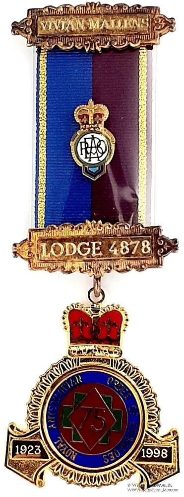 АВЕРС: двойной круг на фоне орнамента с наименованием Ордена Royal Antediluvian Order of Buffaloes. В центре ромб с цифрой 75 на фоне креста. Верх орнамента украшен короной. В нижней части на лентах в виде стрелок даты: 1923-1998.