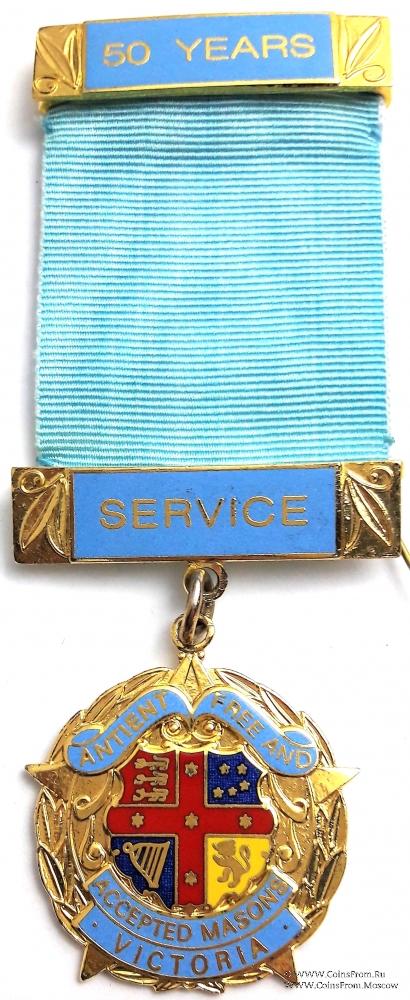 Медаль в форме круга, образованного венком, на фоне которого пятиконечная звезда с малым гербом в виде щита центре. Выше и ниже щита на голубой ленте надпись на английском языке: ANTIENT FREE AND ACCEPTED MASONS. VICTORIA – Древние свободные и принятые Масоны. На реверсе знака гравировка WOR. BRO. E.M. EDWARDS 1947-1997.