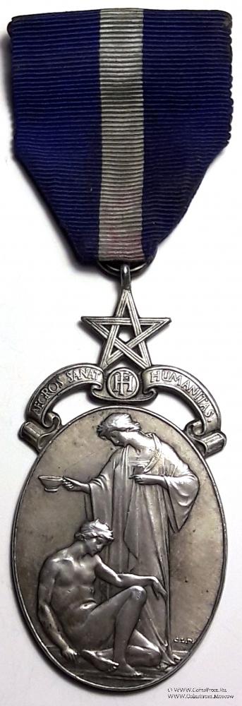 Медаль овальной формы с рельефным изображением. Над знаком лента с надписью на латыни AEGROS SANAT HUMANITAS - Страждущих исцеляет Добродетель, по центру в круге вязь из 2 букв H F, над кругом пятиконечная звезда с кольцом для крепления на верхнем луче.