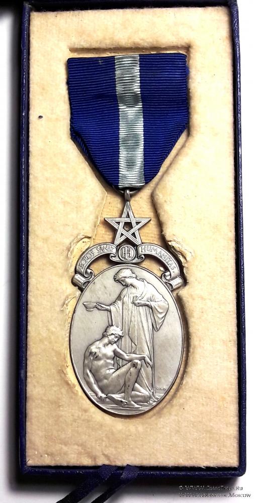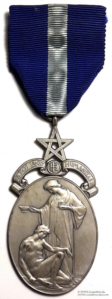Медаль овальной формы с рельефным изображением. Над знаком лента с надписью на латыни AEGROS SANAT HUMANITAS - Страждущих исцеляет Добродетель, по центру в круге вязь из 2 букв H F, над кругом пятиконечная звезда с кольцом для крепления на верхнем луче.