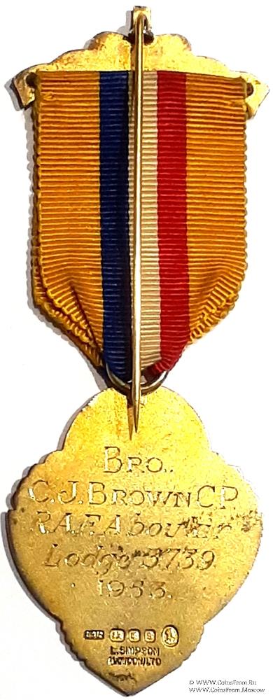 РЕВЕРС: клеймо производителя: LSL, L.Simpson London. LTD, лев, голова, s. (1953). Профиль королевы, повёрнутый вправо. Гравировка: Bro. C.J. Brown C.P. R.A.F. Aboukir Lodge 3739. 1953.