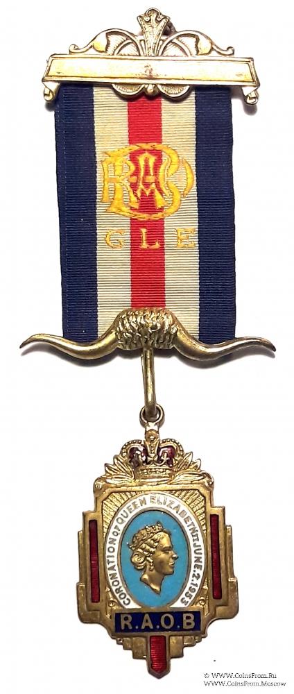Знак прямоугольной формы, по бокам и снизу полосы красной эмали. В центре знака овал голубой эмали с изображением профиля королевы, Обращённый вправо. Вокруг в белом овале надпись на английском языке KORONATION OF QUEEN ELISABETH II JUNE. 2.1953. – коронация Королевы Елизаветы II. Ниже надписи аббревиатура Ордена RAOB - Royal Antediluvian Order of Buffaloes - Старинный Королевский Орден Буйволов. Верх знака увенчан короной красной эмали с кольцом для крепления к колодке.