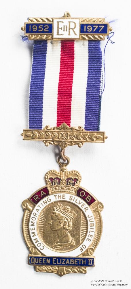 Верхняя часть самого знака заканчивается короной, которая посредством кольца крепится к колодке. По бокам от короны расположена аббревиатура ордена RAOB. В центре знака профиль Королевы, обращённый влево. Внизу знака на синей эмали надпись на английском языке QUEEN ELIZABETH II - «Королева Елизавета II". Вокруг профиля на серебристом фоне надпись COMMEMORATING THE SILVER JUBILEE OF - «В память о серебряном юбилее».