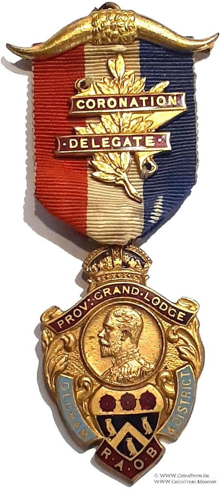 Аверс: в центре знака круг с профильным изображением Короля Георга V. (Короновался 22.06.1911 г.). Ниже портрета малый герб провинции в виде щита с символикой региона. Ниже на ленте наименование региона Oldham&District и аббревиатура Ордена. RAOB. Всё это на фоне орнамента. Выше круга лента красной эмали с надписью Prov. Grand Lodge - Провинциальная Великая Ложа RAOB Oldham&District. Верх знака увенчан короной.