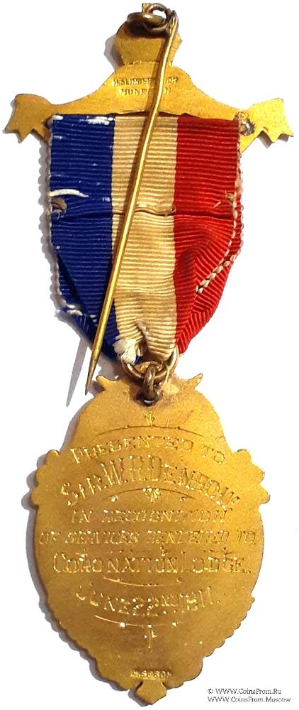 Колодки/медальон: верхняя колодка в виде рогов буйвола, увенчанных короной. На ленте наимено-вание Ложи: Coronation Lodge. Клейо: H. Slingsby&Son Nuneaton.
