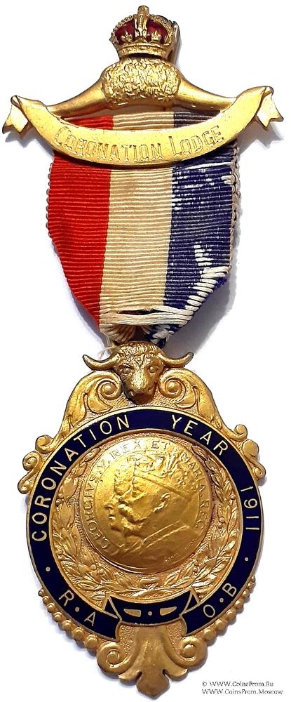 Аверс: в центре знака круг с профильным изображением Короля Георга V и Королевы Марии. (Короновался 22.06.1911 г.). Вокруг портрета надпись: GEORG IV S.V.REX. ET MARIA REG и клеймо J.Fray B’Ham. Портрет окружён венком, вокруг которого лента синей эмали с надписью Coronation Jtar 1911 RAOB. Верх круга украшен объёмным изображением головы буйвола.