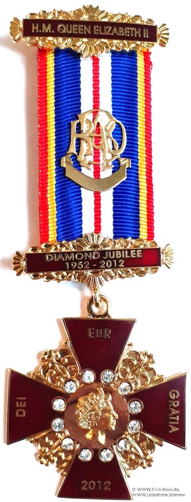АВЕРС: в форме креста красной эмали. На лучах креста надписи: на левом – Dei, на верхнем – E II R, на правом – Gratia, на нижнем 2012. (Dei Gratia (латынь) божьей милостью Королева Elisabeth II). Квадранты креста украшены вставками орнамента. В центре креста на золотом фоне накладное изображение профиля Королевы, повёрнутого вправо. Вокруг профиля 12 камней (Фионит).