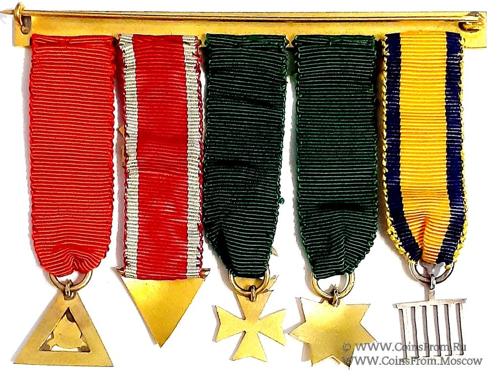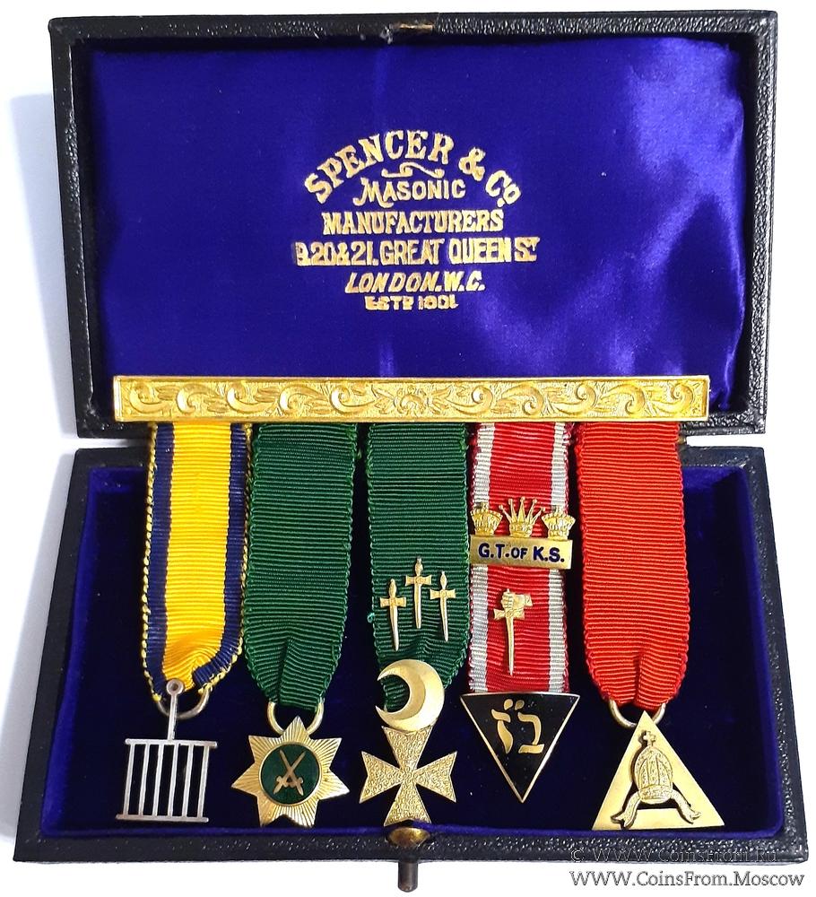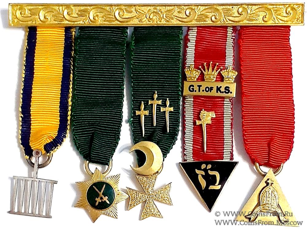 Знак №4 - Великий кровельщик (плиточник) Царя Соломона. Треугольник черной эмали, окаймленный золотой каймой. На лицевой стороне написана цифра 27 еврейскими буквами. Лента красного цвета с серыми полосами по бокам. Медальон на ленте с тремя коронами и буквами G.T.of K.S. (Grand Tilers of King Solomon) Ниже медальона с коронами золотой медальон в виде руки, сжимающей кинжал, направленный вниз.