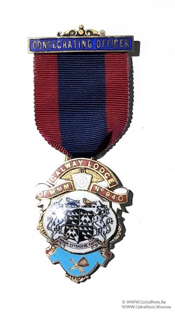 В центре знака накладной овал белой эмали, на котором изображён герб провинции. Над гербом по центру замковый камень в окружении красно-белой ленты с надписью названия и номера ложи Масонов Мастеров Метки CALWAY LODGE OF MMM № 940. Ниже герба на голубой эмали перекрещенные инструменты. Лента характерная для провинциальных Лож МММ синяя с бордовыми полосами по бокам. Верхняя колодка прямоугольная сверху с вензелем по центру и надписью на синей эмали CONSECRATING OFFICER – освящающий офицер.
