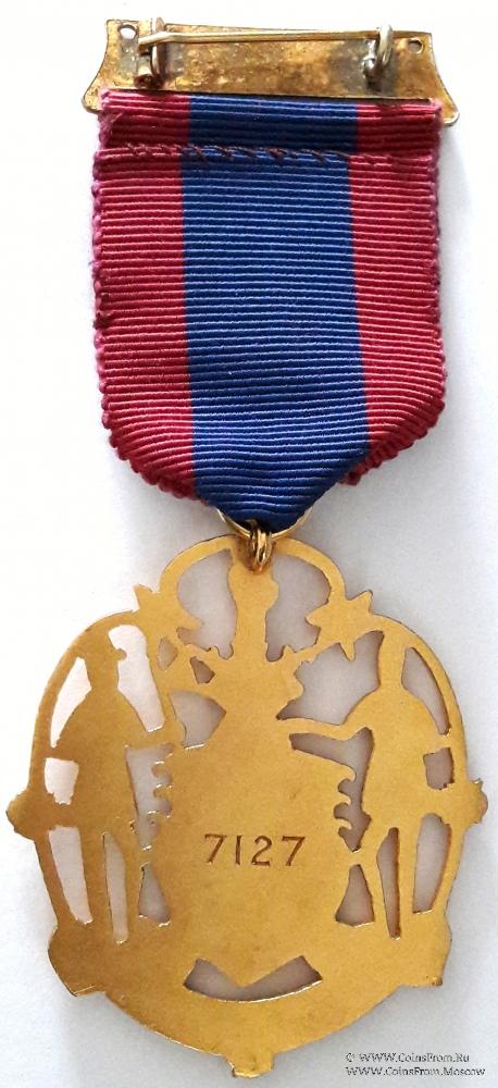 В центре знака герб. Правый (геральд) щитодержатель масон в белом запоне, держащий в правой руке замковый камень белой эмали. Левый щитодержатель масон в белом запоне, держащий в правой руке боевой топор. В центре щита арка белой эмали, с выделенным замковым камнем, на котором изображены метка брата. Верхняя часть щита над аркой красного лучистого цвета, нижняя – синяя. Подножием для щитодержателей служит девизная лента синей эмали, на которой надпись на латыни: LAPIS REPROBATUS CAPUT ANGULI (он есть) камень, пренебреженный вами зиждущими, но сделавшийся главою угла. На щите коронованный шлем, на короне клейнод в виде руки, держащей замковый камень белой эмали. Все фигуры знака "прорезные". На реверсе знака гравировка 7127 - номер регистрации брата как Мастера и его Метки.