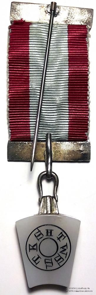 Лента знака голубая по бокам с красными (малиновыми) полосами. В центре ленты медальон из перекрещенных зубила и молотка хромированного цвета. Верхняя и нижняя колодки металлические хромированного цвета. Такое оформление применяется для рядовых членов Ложи.