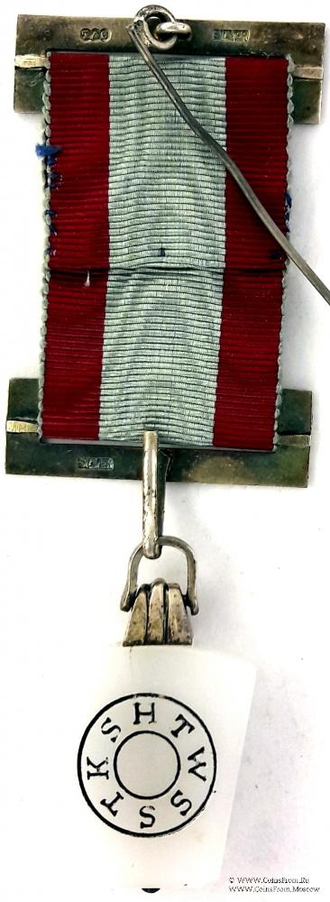 Лента знака голубая по бокам с красными (малиновыми) полосами. В центре ленты медальон из перекрещенных зубила и молотка хромированного цвета. Верхняя и нижняя колодки серебряные в форме прямоугольников с надписями. На верхней колодке CHARITY MARK - благотворительный знак, на нижней колодке Номер Ложи LODGE № 430 Такое цветовое оформление применяется для рядовых членов Ложи.