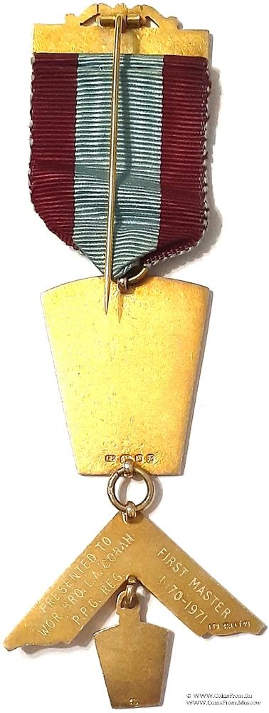 РЕВЕРС: верхняя часть знака клейма ЕР, лев, голова леопарда, р – 1970 г. Средняя часть – наугольник. Клейма: ЕР, лев, голова леопарда, q -1971 г. Гравировка: Presented to Wor. Bro. L.A. Coran PPG Reg. First Master 1970-1971. Нижняя часть подвеска - лев.