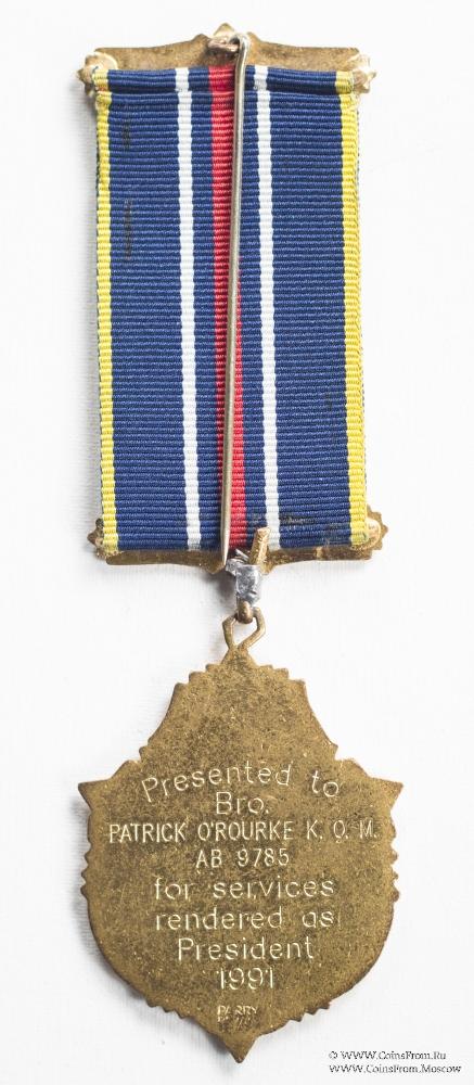 Знак именной, надпись на реверсе знака: PRESENTED TO BRO. PATRICK OROURKE K.O.M. FD 9726 FOR SERVICES RENDERED AS PRESIDENT 1991- Преподнесён брату Patrick O’Rourke Рыцарю ордена Заслуг AB 9726 за службу в качестве президента 1991.