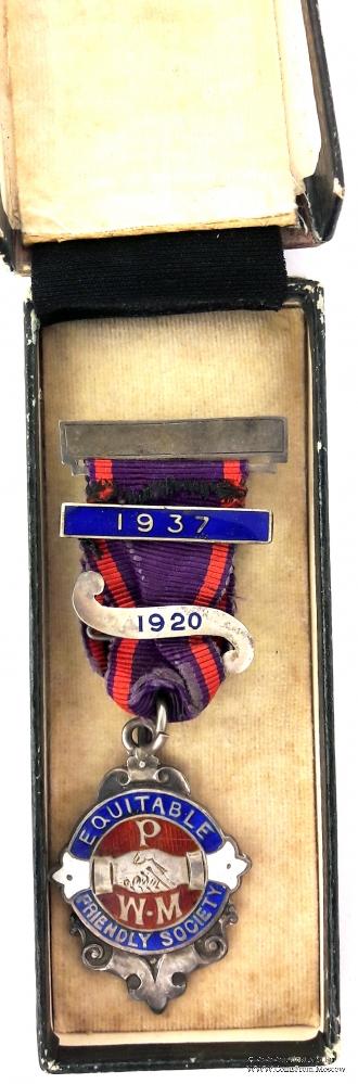 Знак круглой формы на стилизованной подставке. В кругу синей эмали надпись с названием Ордена EQUITABLE FRIENDLY SOCIETY - РАВНОПРАВНОЕ ДРУЖЕСКОЕ ОБЩЕСТВО. В центре на красном фоне рукопожатие с трилистниками по бокам. Буквы P.W.M. (Р.W.M. –Прошлому Досточтимому Мастеру). Гравировка на реверсе знака F. MARCHANT 1912.