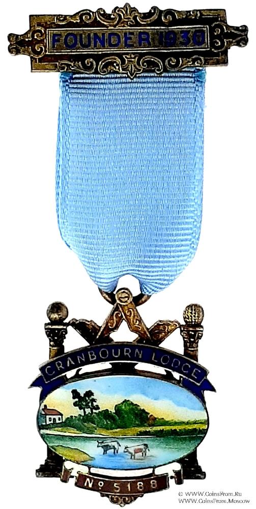 АВЕРС: две символические колонны, соединённые в верхней части наугольником с циркулем. На колоннах накладная пластина овальной формы с картиной по эмали. Сверху и снизу на лентах наименование и номер Ложи (Cranbourn lodge № 5188).