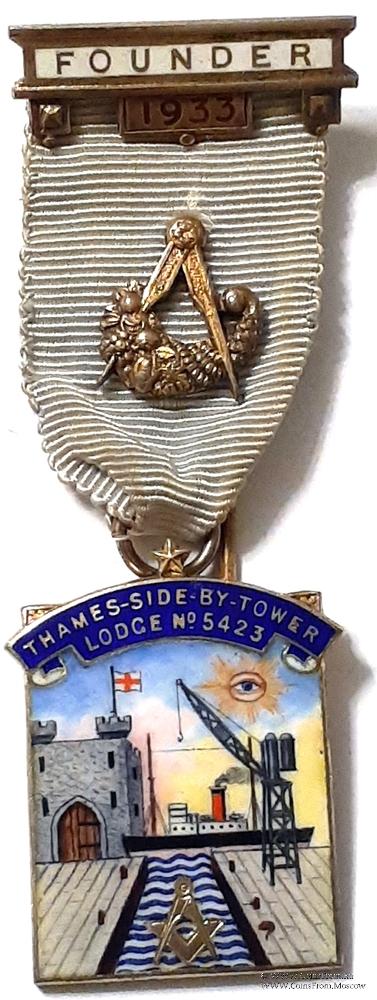 Аверс: рисунок по эмали с изображением корабля, портового крана, здания с флагом Англии, прямоугольной формы. В верхней части синяя лента с наименованием и номером Ложи: Thames-side-by-Tower Lodge № 5423.
