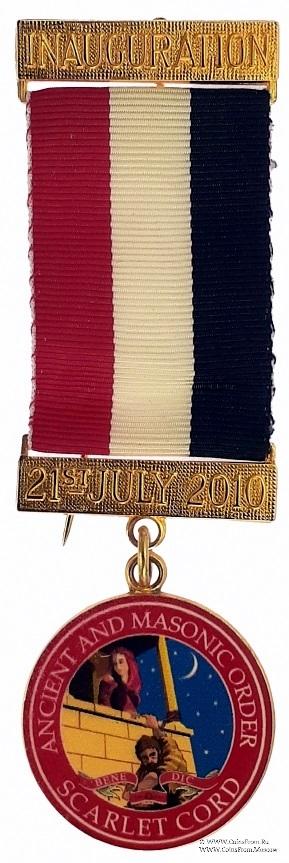 АВЕРС: аналогичный эмблеме Ордена: в двойном красном круге наименование Ордена – Ancient And Masonic Order Scarlet Cord – Старинный, масонский Орден Красного Шнура. В центре рисунок по эмали с эмблемы Ордена.
