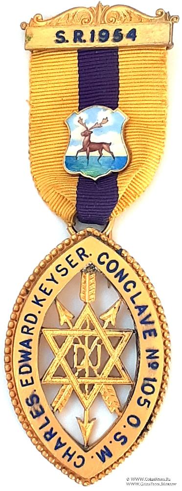 Аверс: символ Ордена Тайных наблюдателей два пересекающихся равносторонних треугольника, образующих 6-конечную звезду. Две перекрещенных стрелы остриём вверх и одна стрела направ-лена вниз от кольца и заканчивается ниже вершины одного из треугольников. В центре сплетения всех фигур две буквы: DJ (Давида, Ионофана). Изображение символа заключено в остроконечный овал с надписью: Charles. Edward. Keyser. Conclave № 105 O.S.M. (Order of the Secret Monitor) Конклав Чарльза Эдварда Кайзера № 105, Орден Тайных Наблюдателей.