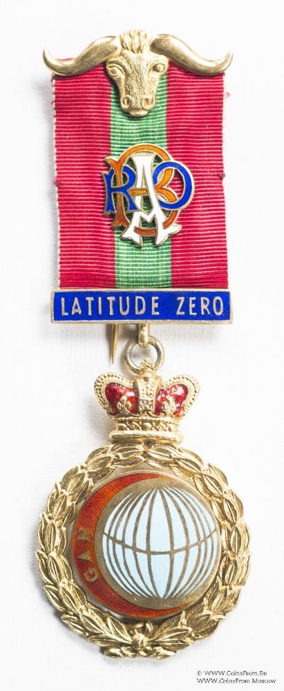 Цвет ленты красный с зелёной полосой в центре. В центре ленты медальон в форме вязи из букв RAOB. Верхняя колодка в форме головы буйвола с рогами и иглой для носки с обратной стороны. Нижняя колодка в виде прямоугольника синей эмали с надписью LATITUDE ZERO – широта ноль.