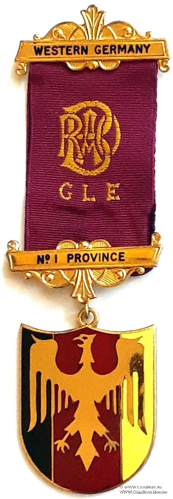КОЛОДКИ/МЕДАЛЬОН: верхняя колодка в форме ленты на фоне стилизованного орнамента, на которой надпись WESTERN GERMANY (Западная Германия) и иглой для носки с обратной стороны. Нижняя колодка в виде ленты на фоне стилизованного орнамента с надписью № 1 PROVINCE.