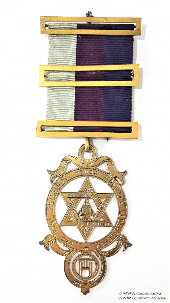 Круг с надписями на латыни. В круге гексаграмма в гексаграмме треугольник, циркуль. Ниже в ленте символ Королевской Арки - в круге тройное тау.