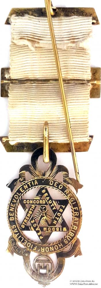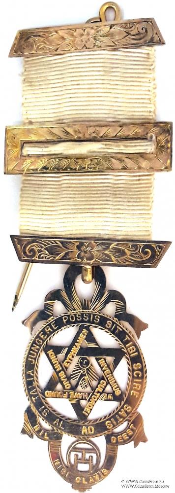 Круг с надписями на латыни. В круге гексаграмма в гексаграмме треугольник, циркуль. Ниже в ленте символ Королевской Арки - в круге тройное тау.