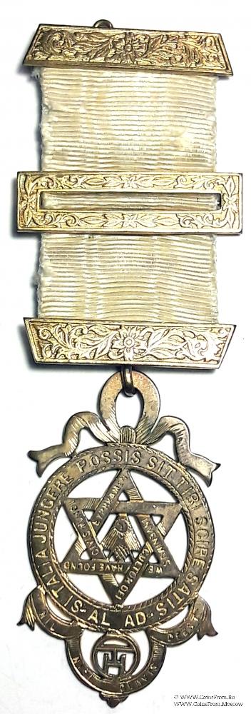 Круг с надписями на латыни. В круге гексаграмма в гексаграмме треугольник, циркуль. Ниже в ленте символ Королевской Арки - в круге тройное тау.