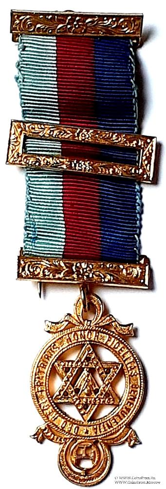 Аверс: надписи выполнены выпуклыми буквами. Фон под буквами рифлёный. Знак D= 25 мм. Форма ленты над кругом с небольшой петлёй. Центральная петля с круглым отверстием. Под кругом лента менее объёмная без прорезей, направленная вдоль круга, символы в центре и в нижней части «не прорезные». На всём знаке прорези между символами выполнены сверлениями. Центральный символ стандартный – лучи от лучезарной дельты над циркулем. Под циркулем глобус. Нижняя часть круглая. Клейм нет.