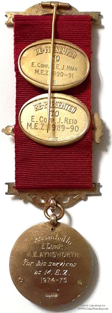 КОЛОДКИ/МЕДАЛЬОН: верхняя колодка выгнутая с надписью на Латыни Undetr Ges Mus. Нижняя ко-лодка прямоугольная, украшенная орнаментом снизу, с надписью M.E.Z. 1974-75. В центре ленты медальон круглой формы с рисунком по эмали, размещённый на трёх булавах. На обратной стороне ленты два дополнительных медальона, говорящих о том, что знак вручался несколько раз, разным людям. Верхний медальон с надписью: RE-PRESENTED TO E. Comp. K.E. Head M.E.Z. 1990-91. Нижний медальон: RE-PRESENTED TO E. Comp. J. Reid M.E.Z. 1989-90
