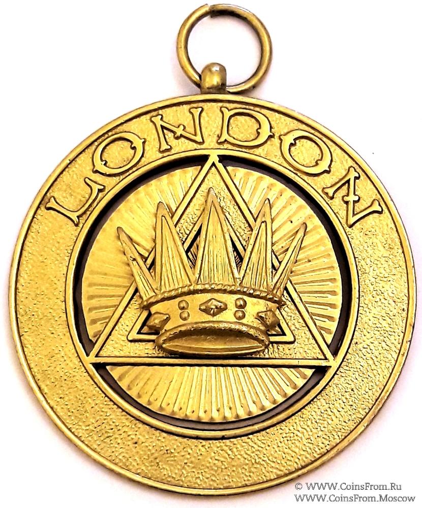 Аверс: круглой формы в двойном круге надпись LONDON, внутри сияющие лучи на фоне которых наложен равносторонний треугольник с короной. Символ Первого Принципала Капитула Королевской Арки. LONDON GRAND RANK (Высший Лондонский Ранг). Диаметр 44 мм.
