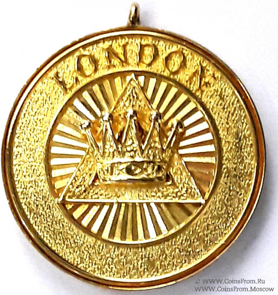 Аверс: круглой формы в золотом кольце надпись LONDON, внутри сияющие лучи на фоне которых наложен равносторонний треугольник с короной. Символ Первого Принципала Капитула Королевской Арки.