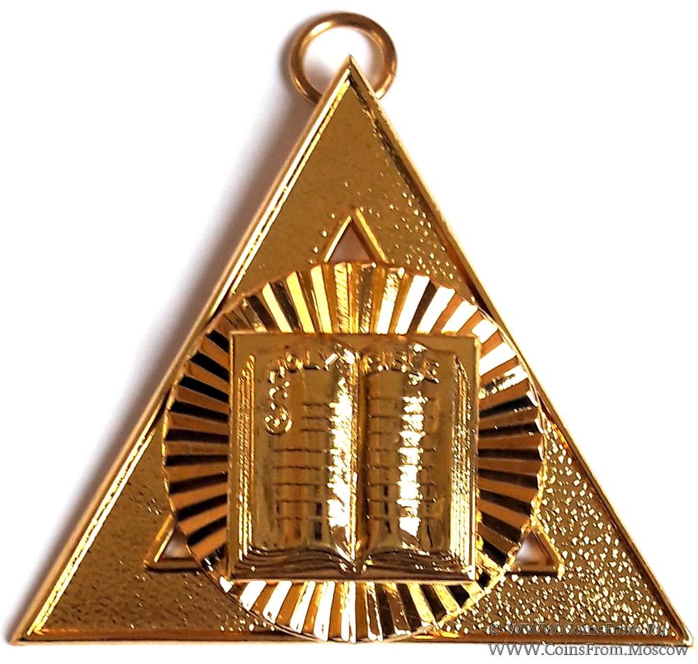 Аверс: треугольной формы. Размер стороны 65 мм. На двойном равностороннем треугольнике накладной круг с лучистым фоном, на котором раскрытая книга - эмблема должности Третьего Принципала.